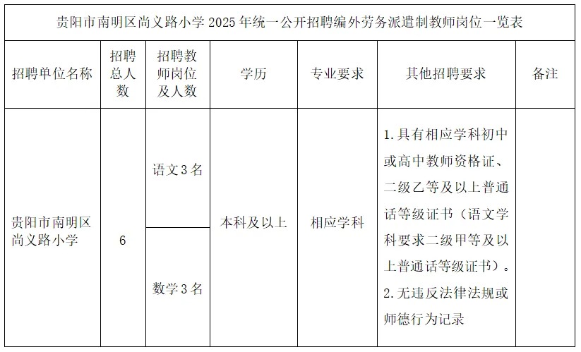 原標(biāo)題:貴陽市南明區(qū)尚義路小學(xué)2025年統(tǒng)一公開招聘編外勞務(wù)派遣制教師