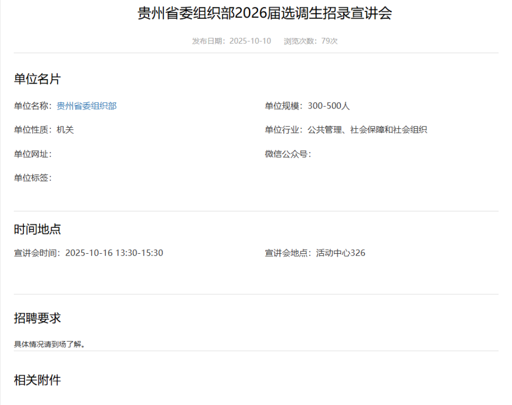 貴州2026年定向選調(diào)生招錄公告即將啟動(dòng),貴州省委組織部 2026 屆選調(diào)生招錄宣講會(huì)將于2025年10月16日13:30-15:30展開(kāi)。