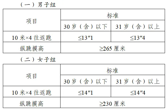 備注:10米×4往返跑每人最多可測2次,1次測試達(dá)標(biāo)即視為該項(xiàng)目測試合格;縱跳摸高每人最多可測3次,1次測試達(dá)標(biāo)即視為該項(xiàng)目測試合格。其中一項(xiàng)體能測試不合格的,取消進(jìn)入下一環(huán)節(jié)資格。